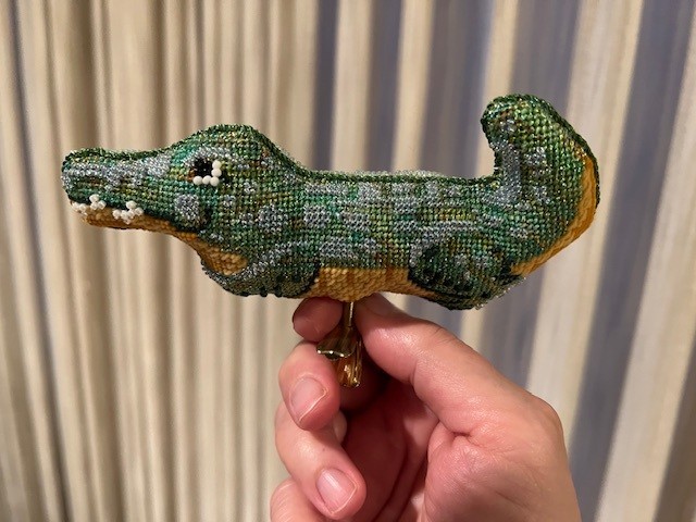I’ve stitched ornaments that celebrate the city and others that are specific to the state. I’m particularly fond of the peacock and the alligator ornament because each depicts a “spirit animal” for one of my series. The gator represents the Cajun Country Mysteries, while peacocks Gumbo and Jambalaya rule the roost of Bon Vee Culinary House Museum in the Vintage Cookbook Mysteries.