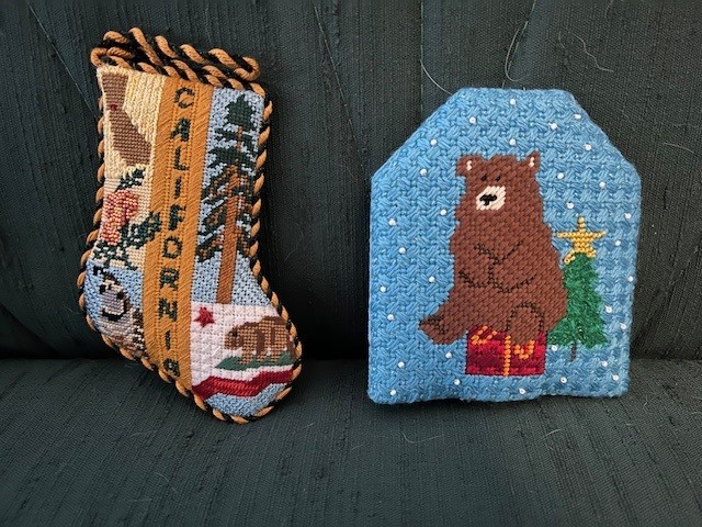 I don’t solely stitch New Orleans and Louisiana needlepoints. My ornaments cover a wide range of memories. Lately, I’ve even added stitched homages to California and my Golden Motel Mystery series, like a California mini stocking and a goofy bear. Three guesses what the spirit animal is for this series, wink wink.