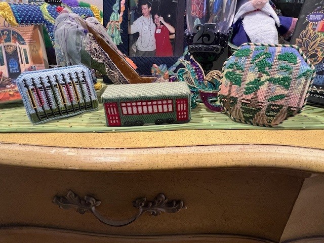 I’ve also stitched general NOLA-themed pieces that decorate the display I’ve created in our hallway. The makeshift diorama is year round except for December when I sub in holiday decorations. My favorite item in the display is the streetcar I stitched. Someday I’ll needlepoint one of the glorious homes on St. Charles Avenue and make it look like the streetcar is trundling past it!