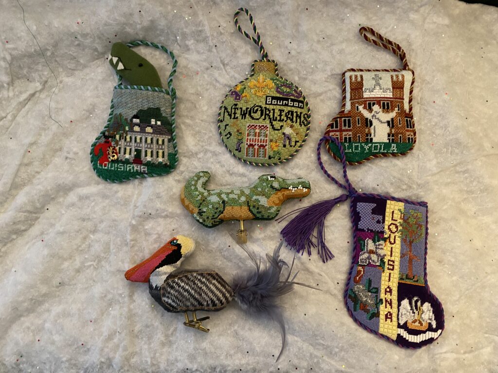 New Orleans never met a holiday it didn’t embrace with irrepressible fervor, and Christmas is no exception. The city’s iconic iron galleries glow with holiday light displays. Poinsettias decorate courtyard fountains. Historic Garden District mansions sport decorations and garlands. Even the streetcars wear cheery Christmas wreaths. I’ve been lucky to spend a few holiday seasons in the City that Care Forgot, but they’re few and far between. That’s why I’ve turned to needlepoint, my favorite hobby, to at least give me the feeling of the Big Easy in my own holiday decorations.
