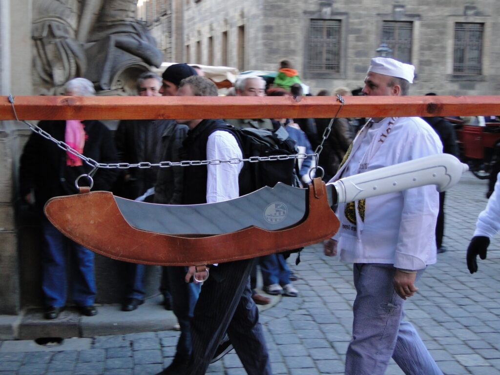 As time went on, making stollen became a competition to see how big you could make it. In 1730, to celebrate his military victories, King Augustus II of Saxony commissioned a stollen loaf that weighed almost three tons. A special oven had to be built to bake it. The loaf required a six-foot-long knife to slice it, and it served 24,000 people.